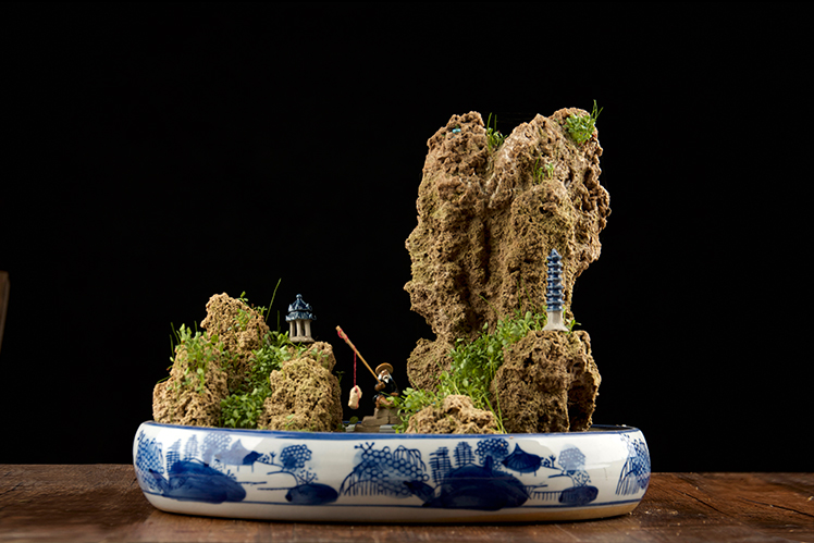 吸水石盆景像一座“濃縮”的青山,一瞬間讓人感到仿佛穿越時空,回到了古代。